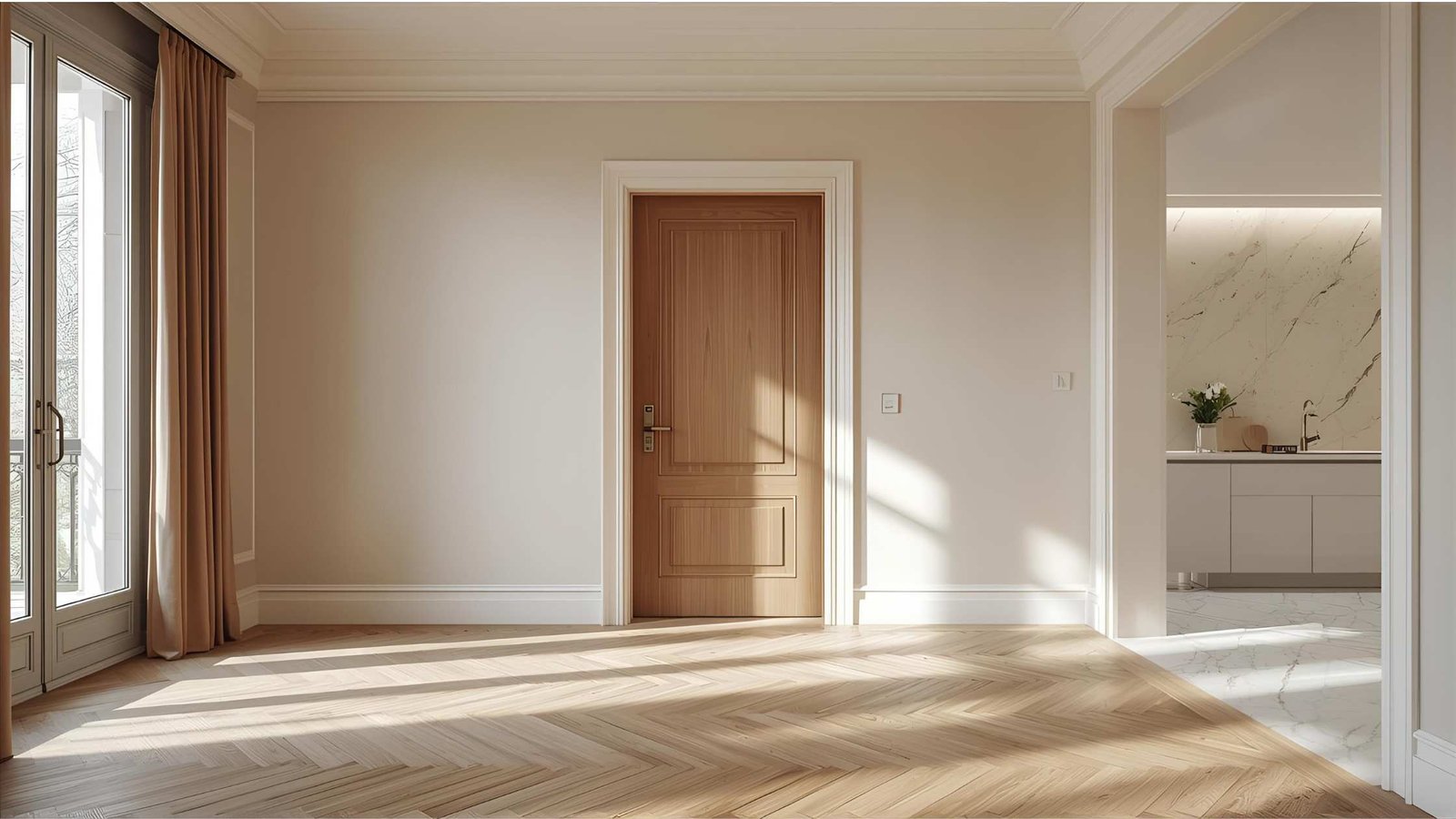 Parquet massif chêne + peinture minérale teinte miel pâle + marbre Carrare murs + moulures peintes blanc/gris clair. Intemporel.